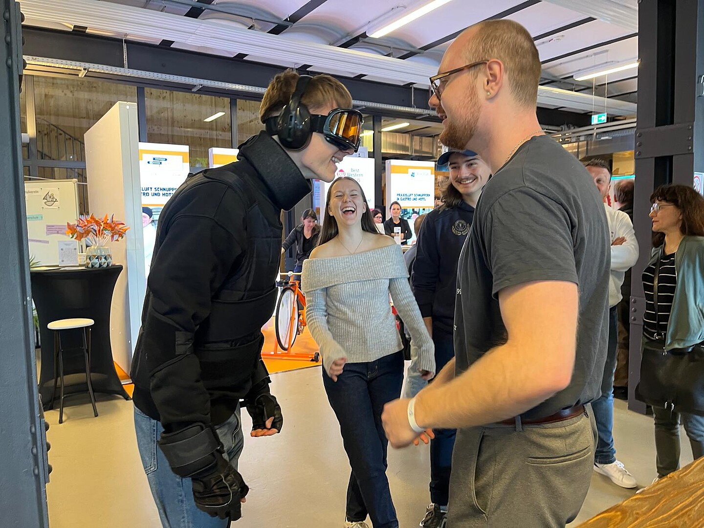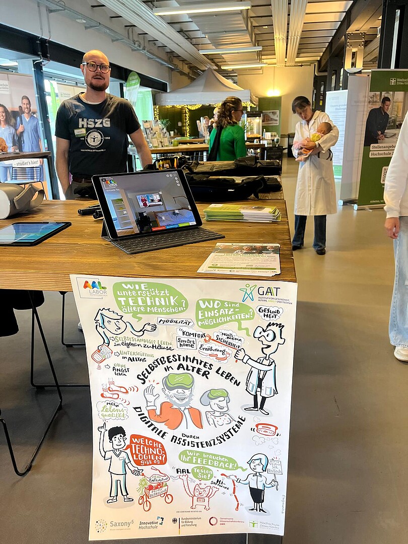 The GAT Institute provided exciting hands-on experiences. At the booth, interested visitors could try out innovative assistive technologies from the AAL laboratory (link) for themselves. Particularly popular was the age simulation suit, which allows users to experience firsthand how age-related limitations affect everyday life.
