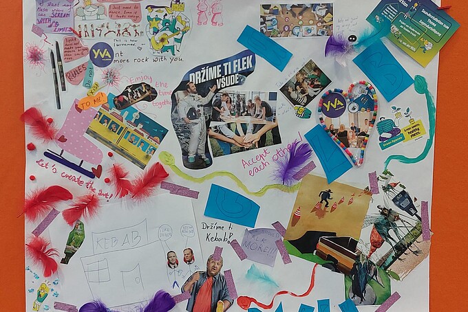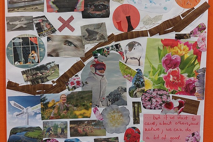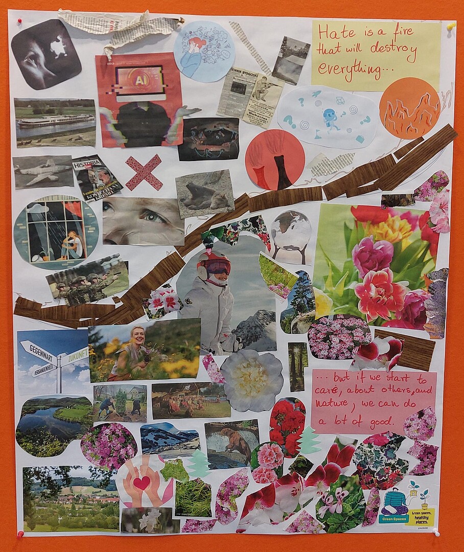 In order to identify existing points of contact with regional structural change and to engage in a more detailed exchange of interests, wishes and demands, the participants were able to create collages in a group work session. Two groups were formed to focus on different topics. One group created a collage in which they recorded their fears and demands regarding the future of the region. The topics of environmental protection and diversity were particularly prominent. The other group's collage dealt with the topic of youth participation. Here, the demand for places to spend time outside of school and family life became clear. Young people want places where they can interact with their peers and develop their creativity. The results were proudly presented and stimulated discussion. They will subsequently be displayed at the university.